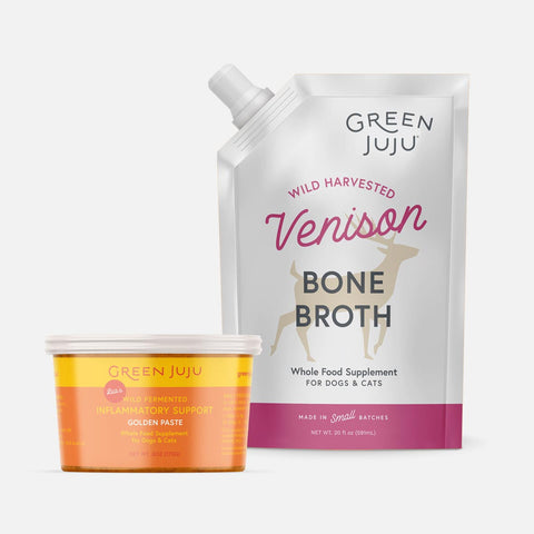 Providing structural support to connective tissues is equally important. Green Juju’s Venison Bone Broth supplies collagen, gelatin, proline, and other amino acids associated with bone broth dog joint health. Delivered in a whole-food, highly bioavailable form, these nutrients are readily absorbed and used to support repair and ongoing maintenance, particularly in aging dogs.