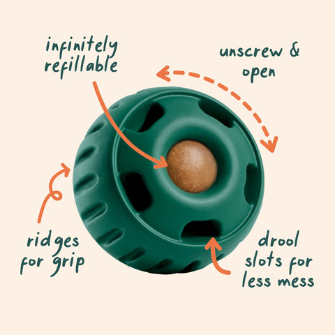 My mama fills this toy with Green Juju and freezes it, and suddenly I have a fun job that keeps me busy and calm. Licking it helps me focus, especially when exciting things are happening. It’s perfect for puppies who need something delicious to do while they practice settling. Hot tip: didn’t plan ahead to freeze? Two of our sliders fit in here perfectly.