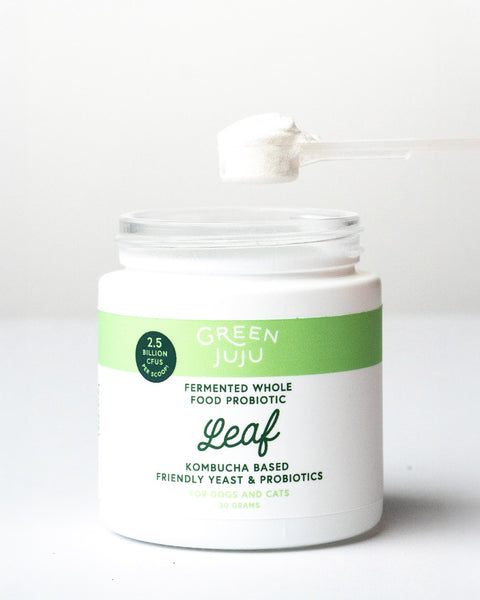 A favorite of mine is Green Juju’s Leaf Fermented Probiotic, a long-fermented, kombucha-based, dairy-free topper rich with over 300 wild strains of beneficial bacteria. It’s especially helpful for pets recovering from antibiotic use or struggling with yeast-related issues, promoting gut balance and strengthening the skin’s natural defenses so your pet feels more comfortable in their own coat.